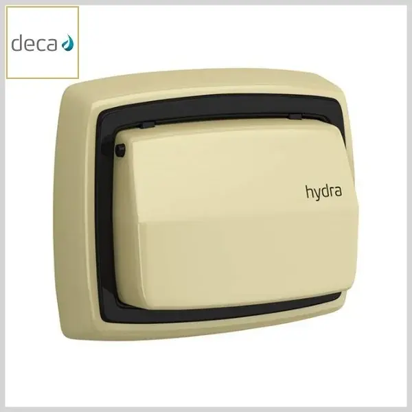 Produto com acionador e canopla em metal na cor bege claro, sendo indicado para acabamento e acionamento de bases de válvulas de descarga da linha original HydraMax (1.1/4 e 1.1/2pol).