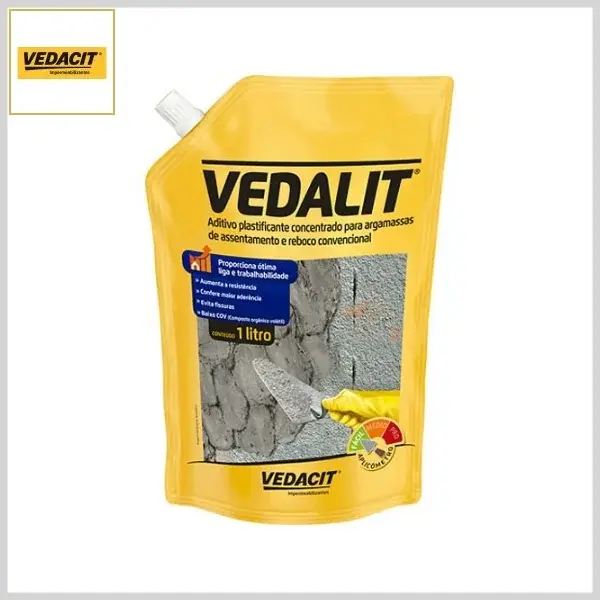 VEDALIT é um aditivo concentrado que proporciona ótima trabalhabilidade a argamassas e rebocos. Por ser líquido, facilita o trabalho, proporcionando economia de material e excelente acabamento. Agrega uma série de vantagens às argamassas: maior aderência, coesão, ausência de fissuras e menor exsudação. Argamassas preparadas com Vedalit não precisam ser curtidas.