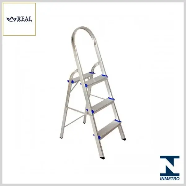 As escadas domésticas da REAL são produzidas em alumínio de liga especial super resistente, suportando cargas de trabalho de até 120kg. Os degraus e sapatas são antiderrapantes o que proporciona maior segurança ao usuário. São equipadas com travas de segurança em alumínio, com articulação lateral e sistemas de sustentação traseira em "X". Produto certificado pelo Inmetro.