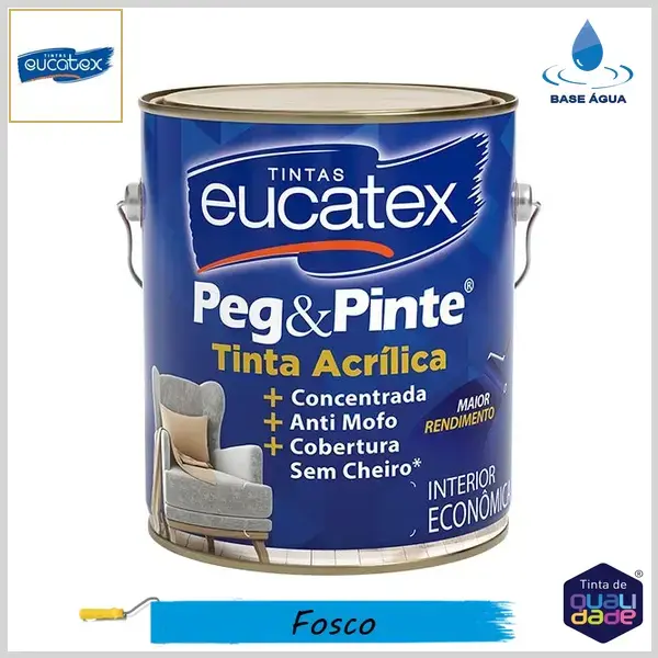 Tinta Acrílica Peg-e-Pinte da Eucatex é um produto anti-mofo concentrado, de categoria econômica, que apresenta boa qualidade e performance de cobertura, com acabamento fosco. Produzido em diversas cores, não apresenta cheiro após 3 horas de sua aplicação e é indicada para pinturas internas em paredes de alvenaria, concreto, texturas e gesso, entre outros, sempre com a adequada preparação das superfícies.