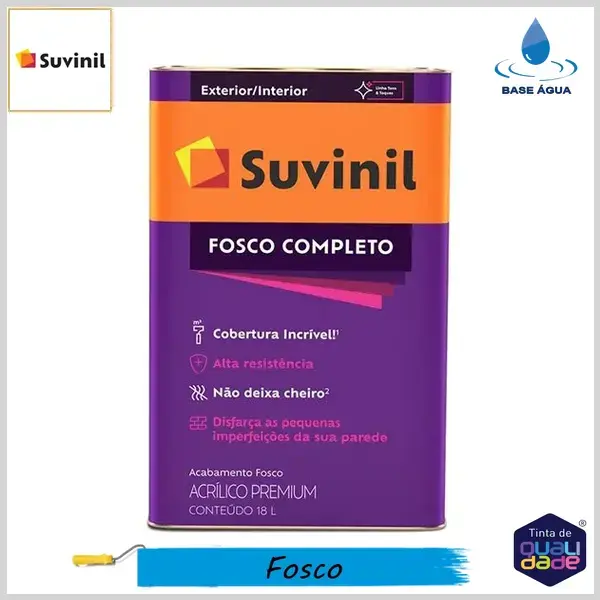 Suvinil Fosco Completo Premium é uma tinta de alta performance, de fácil aplicação, baixo respingamento, ótima cobertura e resistência às intempéries com excelente alastramento. Sua formulação permite que o ambiente fique sem cheiro em até 3 horas após a aplicação, além de apresentar baixo respingamento durante a pintura, ocasionando menos sujeira.