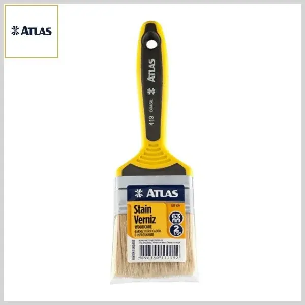 TRINCHA ATLAS 419 é fabricada em 8 tamanhos. Com dupla espessura e cerdas brancas suaves, proporcionam ótimo acabamento e boa capacidade de retenção de tinta. É indicada para pinturas com aplicação de vernizes e stains.
